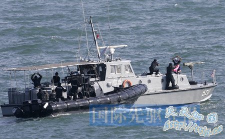 资料图片:图为在一次联合演练中,马来西亚海警在马六甲海峡附近海域截获一艘海盗船。