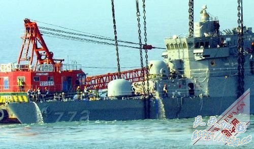 资料图片:4月24日,在韩国白翎岛附近水域,工作人员在打捞“天安”号警戒舰舰首。 新华社/纽西斯通讯社