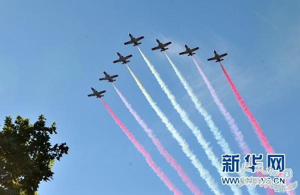 10月12日,西班牙空军的飞机编队在马德里的国庆阅兵仪式中表演。 新华社记者 陈海通 摄