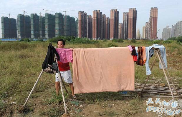 安徽的民工在晒衣服。他们是创造财富的人民。