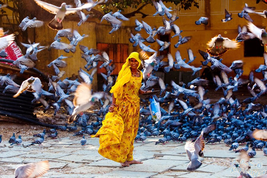 旅游类冠军作品:飞杨——作者:陈明发。【拍摄感言】千百只蓝色鸽子的同时飞扬,配合鲜黄色衣裳的女主角,相得益彰。