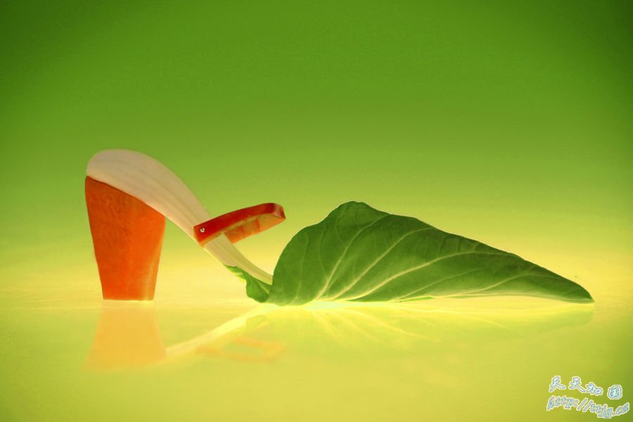 创意类冠军作品:《神奇的高跟鞋》vegetableshow——作者:周峰。【拍摄感言】灵感无边,创意无限。此作品的想法来源于一次静物拍摄中,当时看到卷起的青菜叶突发奇想,于是拿青菜叶做鞋身,胡萝卜做鞋跟,红辣椒做鞋扣,组成高跟鞋的形象,最后经过后期颜色处理完成了这幅前期创意构思较强的作品。
