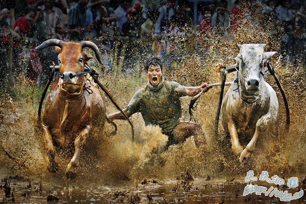 运动类冠军作品:赛牛——作者:杨少铨。【拍摄感言】此片拍摄于西印度尼西亚。拍摄时惊险非凡。一般人是不许下田的,因为牛并非向一直线走,时左时右,而牛的速度也很快,走避不及便会发生惨事。但拍摄的最佳角度则是牛正面冲至,所以还是选择了冒险站在田中央,用较长的镜头,拍了赛事的初段,便赶快逃命。