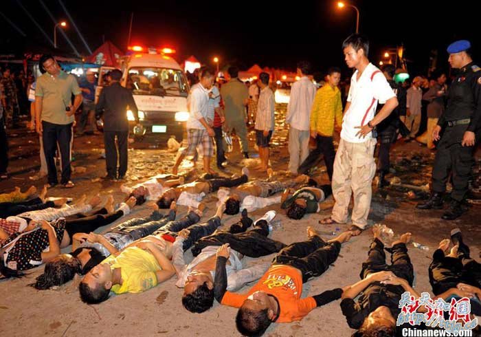 目前,警方仍然封锁现场,步行桥上狼籍一片,许多伤亡者的血迹和衣服散了一地,触目惊心。