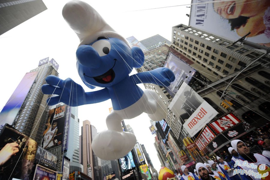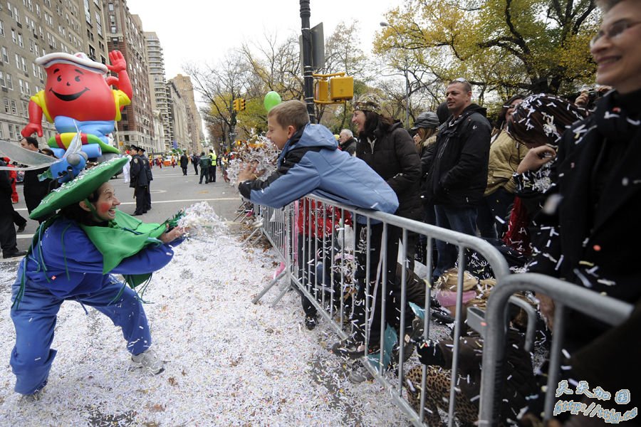 上午9时,游行队伍从曼哈顿77街出发,有七八层楼高的充气卡通明星史努比、蓝精灵、蜘蛛侠,怪物史莱克、小飞象等浩浩荡荡一路前行,游行花车和乐队也簇拥其间,引来观众阵阵尖叫和欢呼。功夫熊猫造型的大型气球也首次在今年的游行队伍中亮相,逼真的造型让观众赞叹不已。游行队伍的最后是驾着雪橇的圣诞老人,一路载歌载舞,把游行气氛推向高潮。
