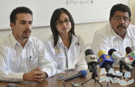 20岁的女大学生贾西亚(中)在宣职就职墨西哥小镇警察局长的记者会上