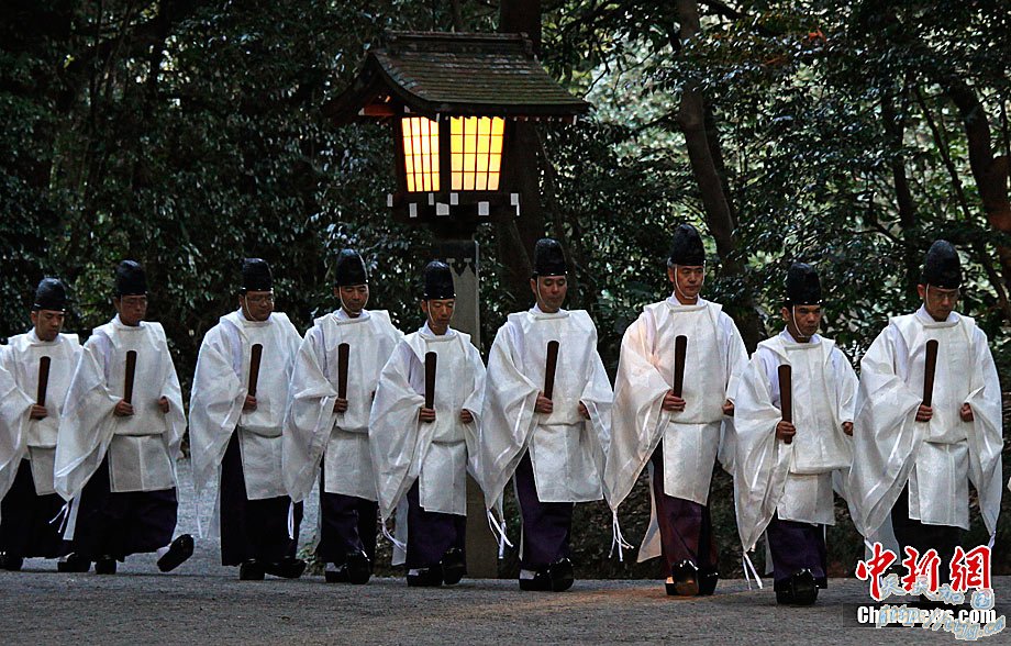 当地时间12月31日,日本东京神社内的祭祀们为民众来年平安举行祈福仪式