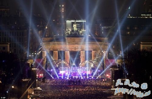 德国著名的勃兰登堡门点亮激光灯束,在数千民众的欢呼声中开始了庆贺新年的仪式。