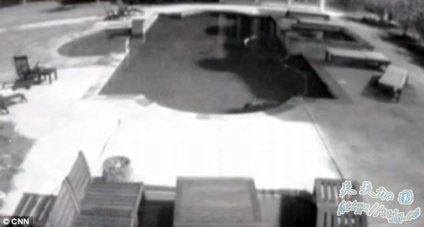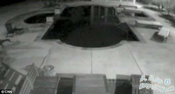 密西西比州一位居民家监控设备拍摄的,陨星在空中爆炸前后产生的亮光。爆炸前的泳池