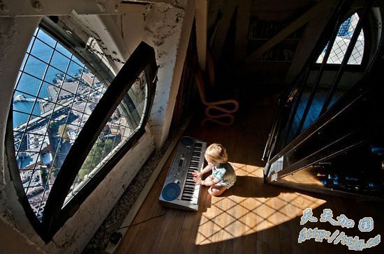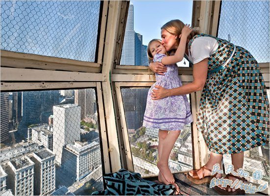 完成于1914年的史密斯塔曾是密西西比河以西最高的建筑,佩特拉夫妇通过一次极其偶然的机会租下塔顶的一套公寓,从这里可以俯瞰整个城区。图为佩特拉夫妇的两个女儿,6岁的西蒙娜和3岁的内奥米在父母卧室窗户边上玩耍。