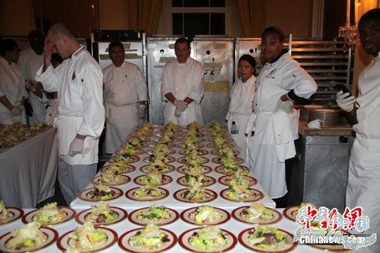 这场国宴有创举:225名宾客将分坐3厅,国宴厅、蓝厅和红厅,然后再前往东厢欣赏娱乐表演。白宫将在蓝、红两厅架设大萤幕,让无缘进国宴厅的宾客看到敬酒画面。