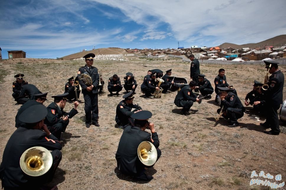 在乌兰巴托,在Altan Ulgii 的葬礼上,奏哀乐的人们正在休息。