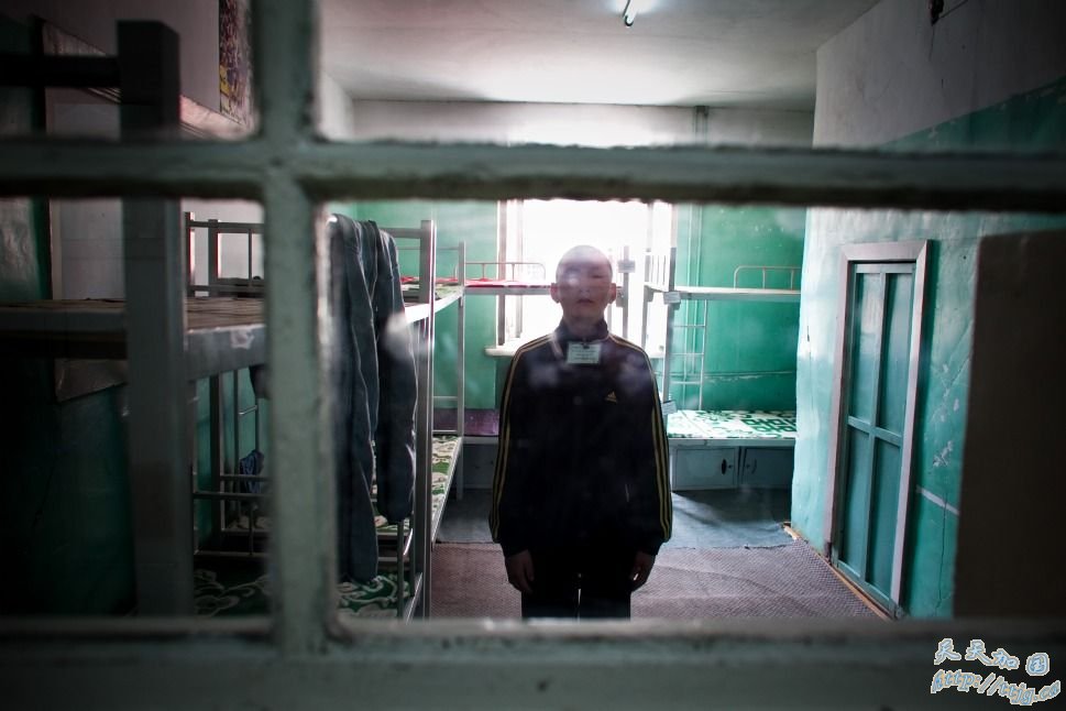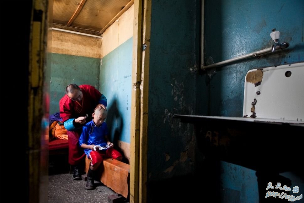 在乌兰巴托的甘丹寺,一个和尚正给一个13岁的小和尚剃头。