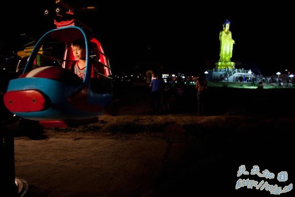 一个孩子在乌兰巴托的佛教纪念公园玩儿旋转飞车。