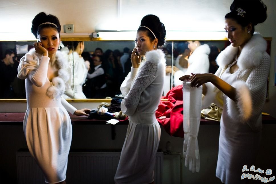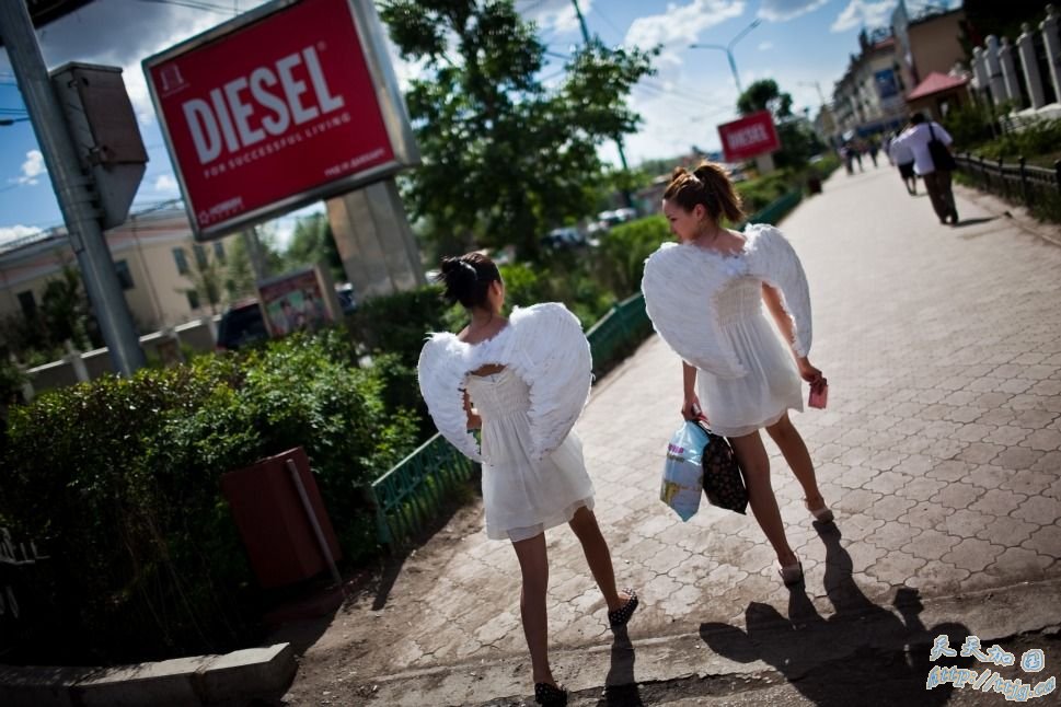 两个女孩儿身带翅膀,走在乌兰巴托的和平大道上,去促销香水。