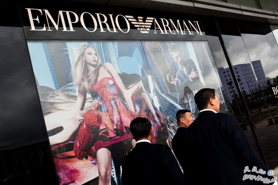 三位蒙古男士步行经过乌兰巴托的阿玛尼服饰店。