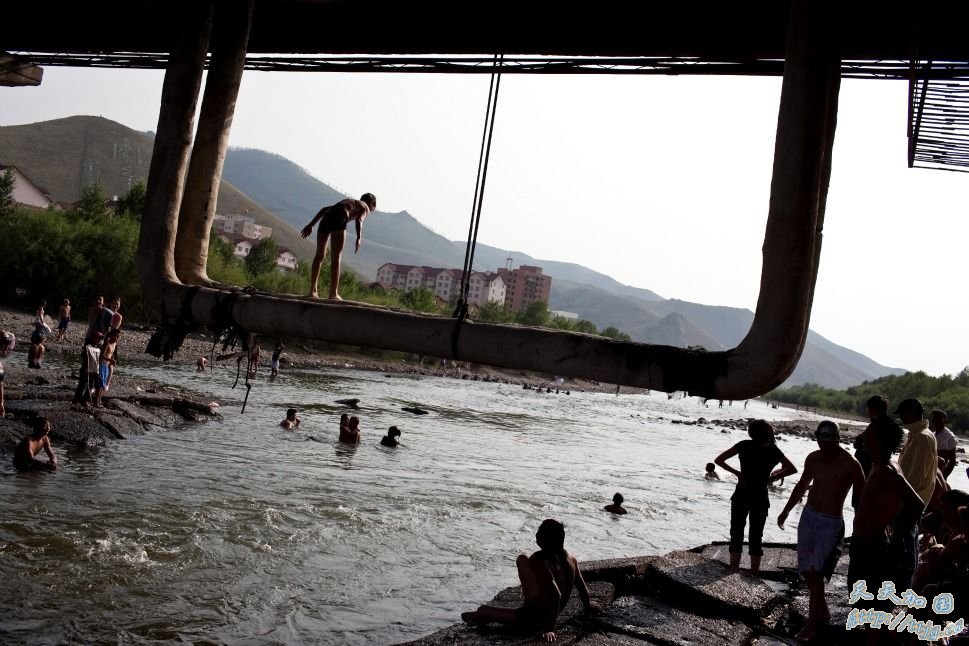 在乌兰巴托的土拉河,很多青少年在游泳。