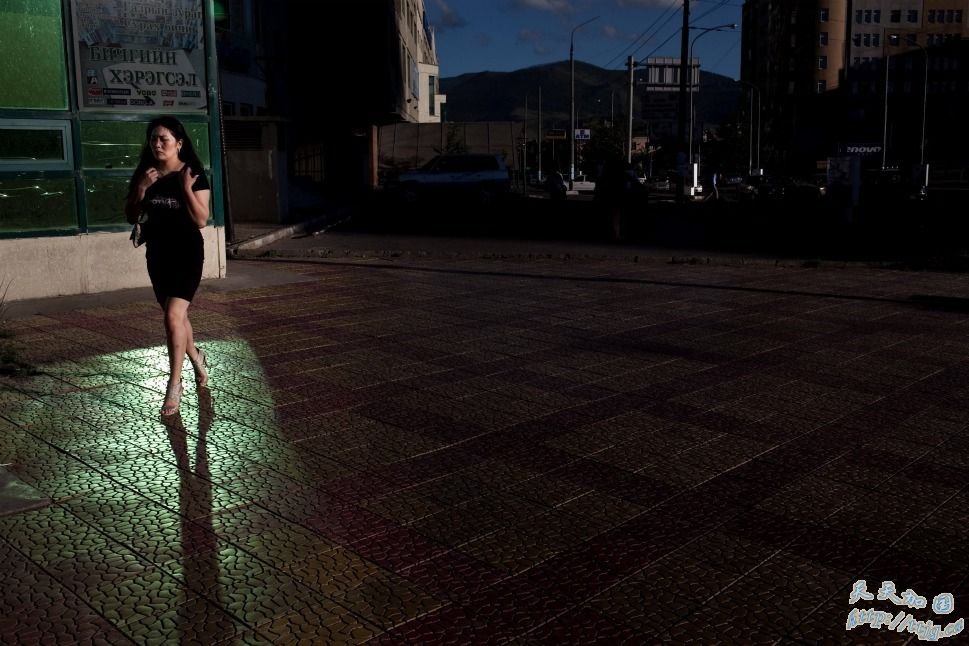 一位蒙古女士在夜晚步行经过乌兰巴托的街道。