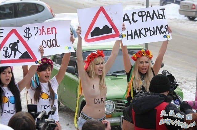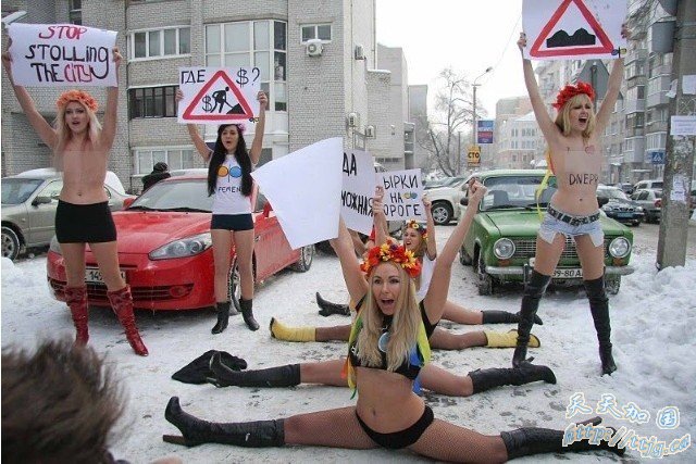 1月25日,乌克兰大名鼎鼎的美女抗议团体FEMEN又有新行动了。她们为了抗议第聂伯彼得罗夫斯克糟糕的交通道路状况,在冻人的寒风里半裸抗议。她们打算通过这样的方式迫使当地政府做出“正确的决定”。