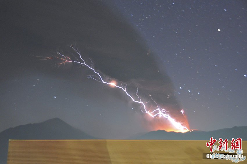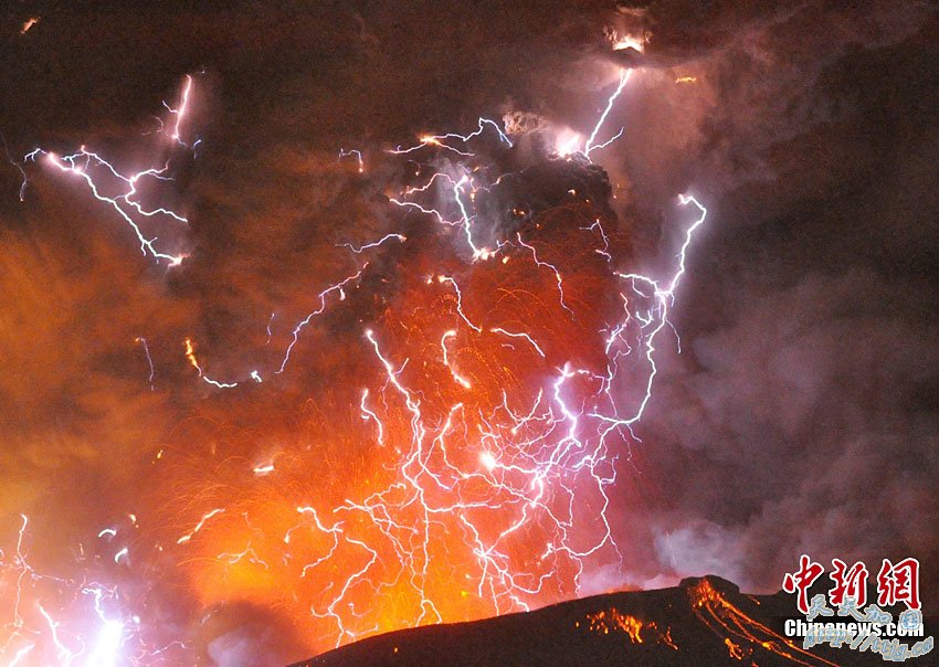 1 月28日,日本新燃岳喷射出灰烬和熔岩,一道道闪电划破火山上空。火山闪电的来历仍然是个谜,据美国阿拉斯加火山天文台专家史蒂夫·麦克努特(Steve McNutt)2010年2月在接受美国国家地理网站采访时介绍,这种奇特现象可能是带电硅(岩浆一部分)从火山喷出时与大气接触时形成的。