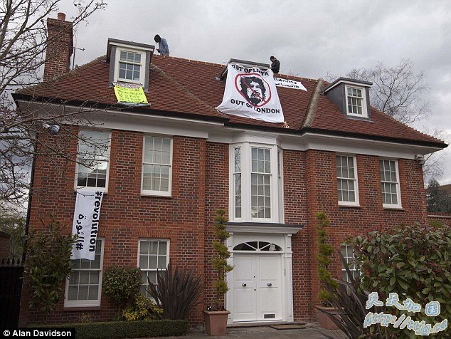 英国《每日邮报》3月10日报道,这栋豪宅位于伦敦最高端的住宅区汉普斯特得花园郊区。它一共四层,拥有前后两个花园、独立的游泳池和电影院,每间房都有宽屏电视。9日,一群自称“打倒暴君”组织的民众占领了这栋宅子,并在屋顶上挂起一面大白旗,上面画着卡扎菲的头像,并写着“滚出利比亚、滚出伦敦”等字样。