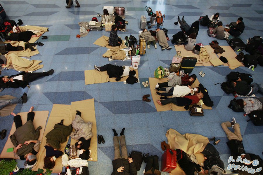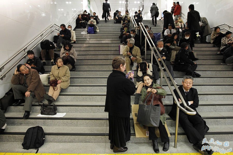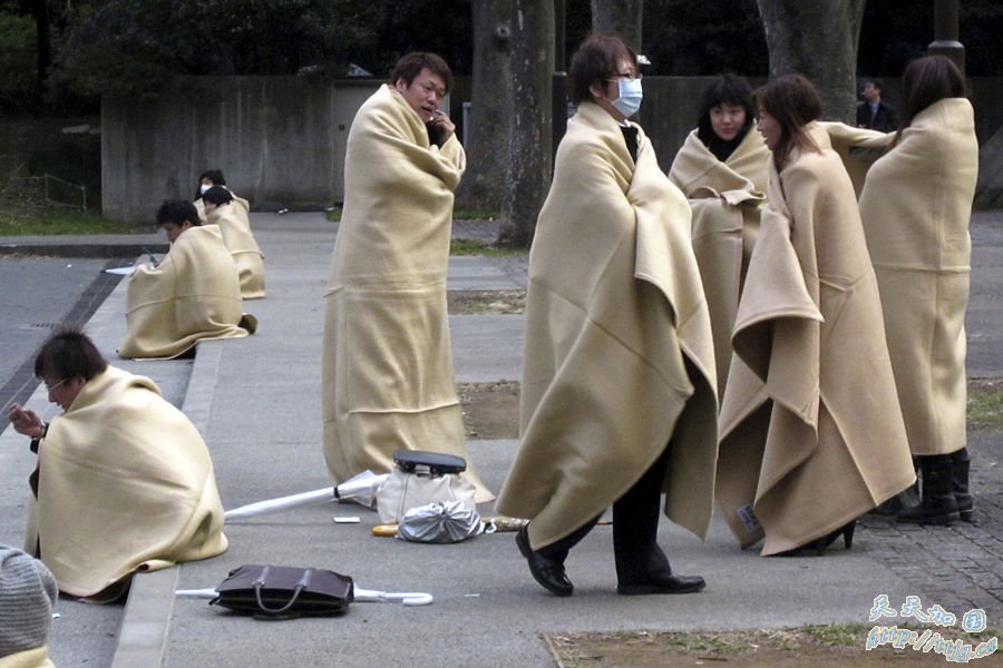 当地时间3月11日,日本东京,滞留市民身披毛毯抵御低温。