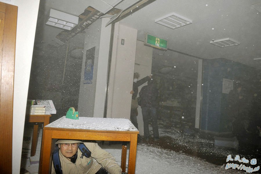 当地时间3月11日,日本仙台一家书店里,一名男子在地震中躲在桌子下面寻求庇护。