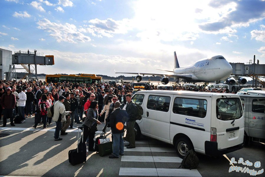 当地时间3月11日,日本东京成田机场,大批旅客从航站楼疏散。
