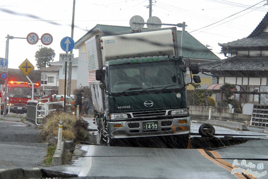 当地时间3月11日,日本福岛县盘城市,一辆大货车停在损毁的道路上。