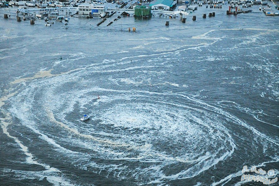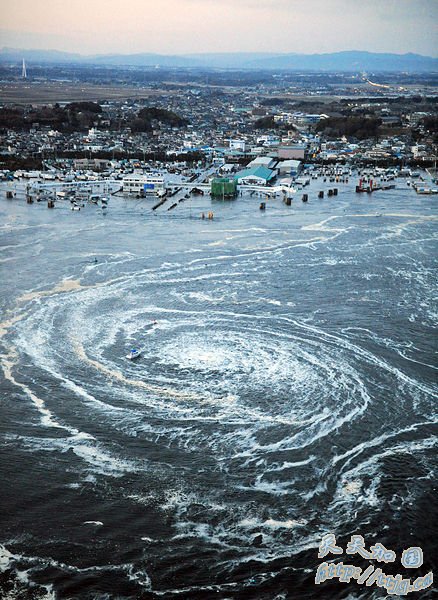 3月11日,日本东北部名取,震后的海啸淹没了大片房屋。海水出现巨大的漩涡。
