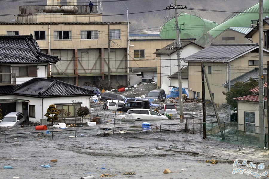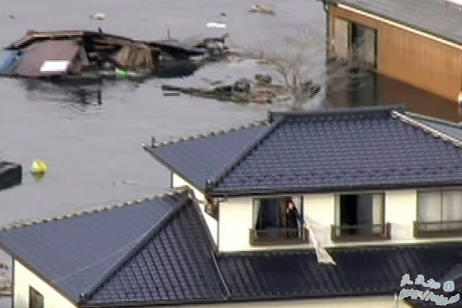 当地时间3月11日,日本仙台遭到海啸袭击地区,一名当地居民在建筑中求救。