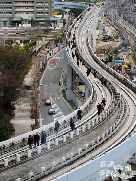 当地时间3月11日,日本东京,铁路停运,旅客步行撤离。