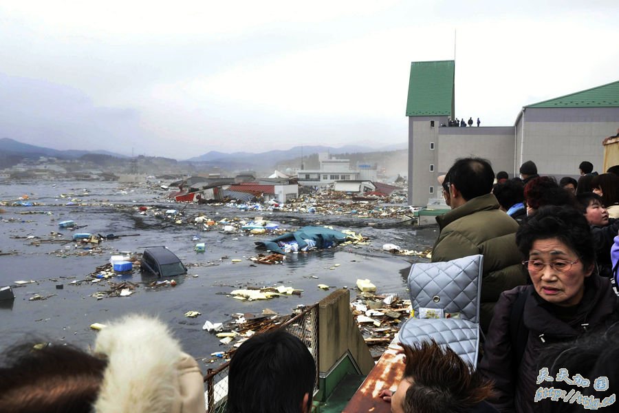 当地时间3月11日,日本宫城县气仙沼市,居民查看被淹没的城镇。