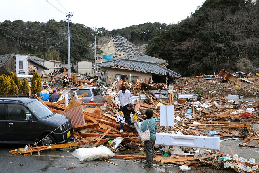 当地时间3月11日,日本福岛县磐城市,人们走在地震后的房屋废墟上。