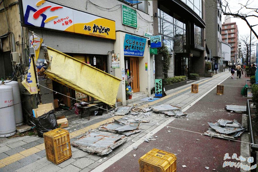 当地时间3月11日,日本宫城县仙台市,街头店铺门前一片狼藉。