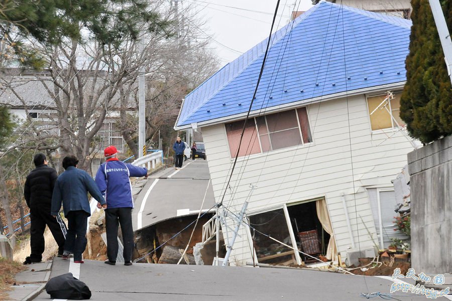 当地时间3月11日,日本福岛县须贺川市,在地震中倒塌的房屋。