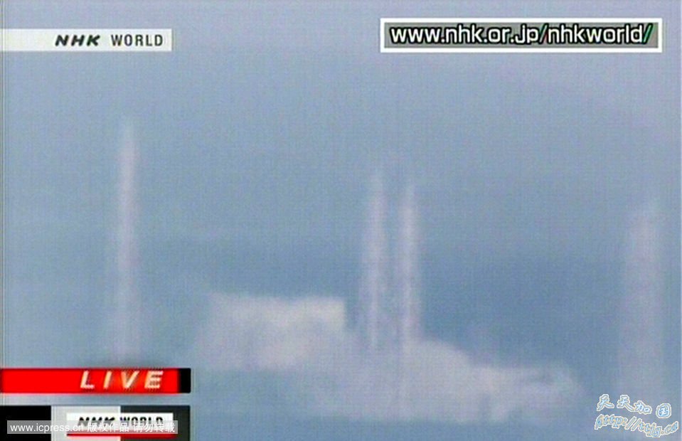 当地时间2011年3月16日,日本NHK电视画面,福岛第一核电站上空再次冒出白烟。日本福岛核电站危机持续,第一核电站3号机组16号早上再度冒出大量白烟。而在清晨,东京电力公司表示,4号机组曾一度冒出火焰,但30分钟后已经熄灭。