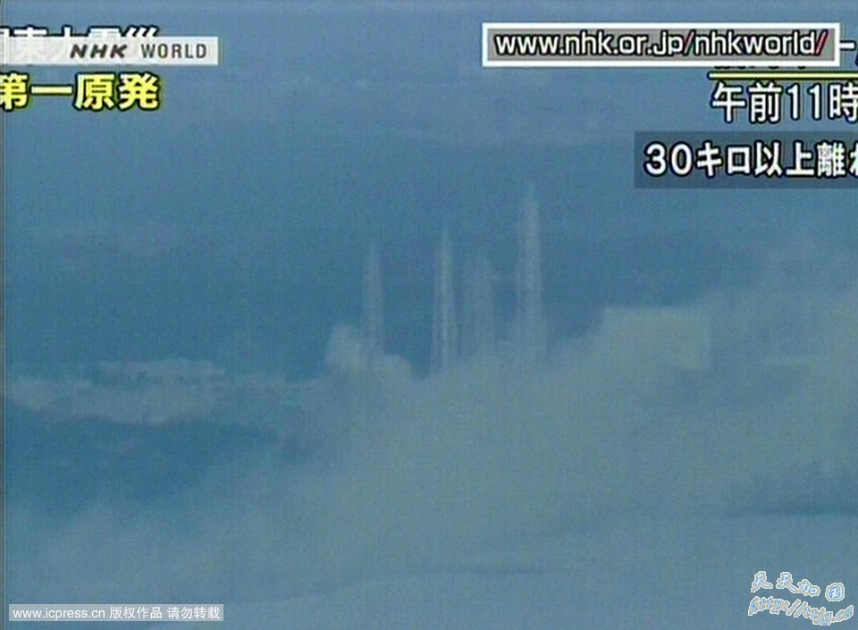 当地时间2011年3月16日,日本NHK电视画面,福岛第一核电站上空再次冒出白烟。