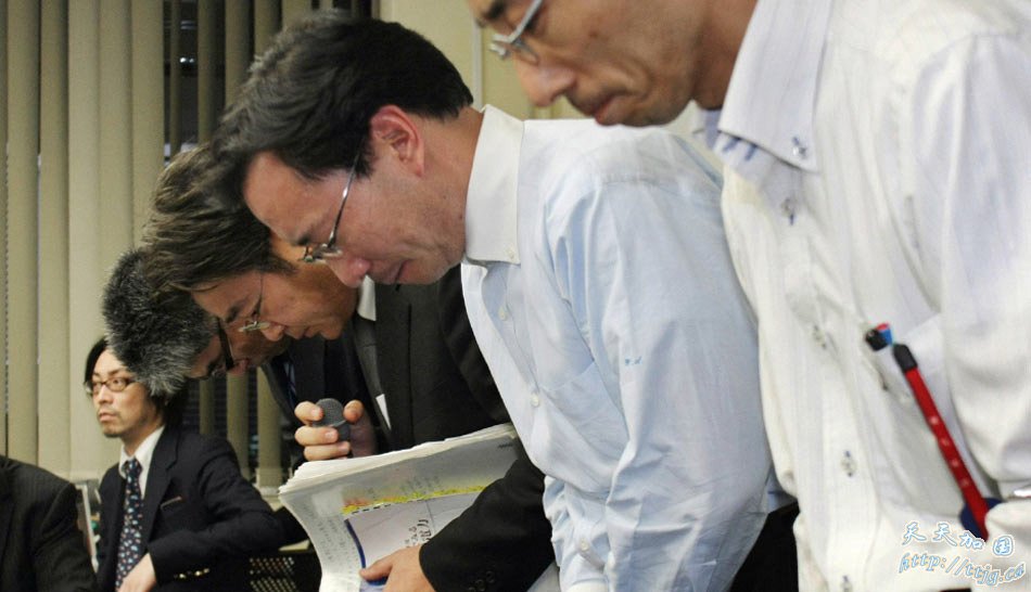 16日,东京电力公司的员工在总部记者会上鞠躬致歉。日本福岛核电站危机持续,第一核电站3号机组16号早上再度冒出大量白烟。而在清晨,东京电力公司表示,4号机组曾一度冒出火焰,但30分钟后已经熄灭