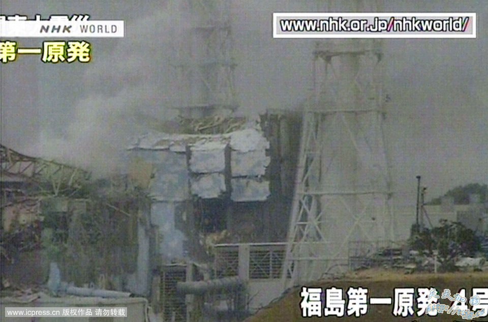 当地时间2011年3月16日,日本NHK电视画面,起火受损的福岛第一核电站4号反应堆。