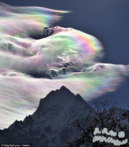 现年51岁的奥列格·巴图诺夫(Oleg Bartunov)是莫斯科斯特恩伯格天文研究所(Sternberg Astronomical Institute)的一名天文学家,在最近的一次赴喜马拉雅山考察活动时,他看到了珠峰上空出现的奇特云彩:阳光照射在云上,云彩却出现了类似彩虹的七彩光线。他立即拿起相机,对着云拍摄了两张照片。
