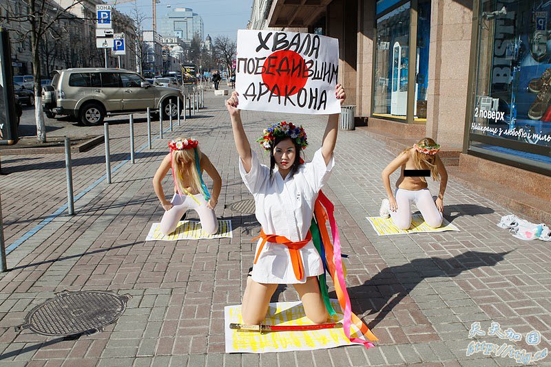 近日,外媒公布了一组乌克兰女权团体Femen最新活动的照片。与以往不同的是,她们此次行动不再抗议,只为声援日本灾民。照片中Femen的成员身着和服跪在基辅街头声援日本大地震的灾民,她们手持武士刀和日本国旗,声称对日本人在灾难面前表现出的凝聚力和自我控制力表示敬意