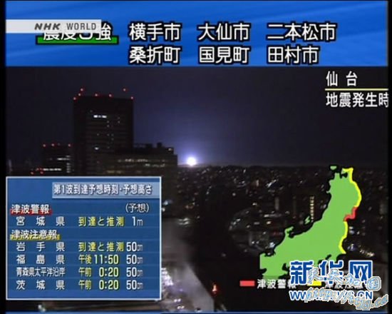 这张4月7日拍摄的日本NHK电视台视频截图显示地震发生时日本仙台市的情况。日本东北地区7日晚发生里氏7.4级地震,日本首都东京也有较强震感,日本气象厅向东北地区太平洋沿岸发出了海啸警报。新华社发