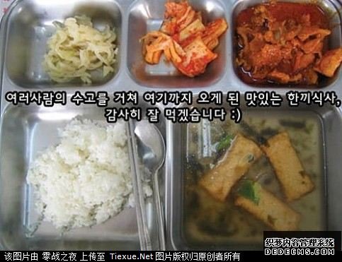 他们没有因为我们是中国来的访客就特意开小灶,当兵的吃什么我们就吃什么,实在令人不敢恭维!回来后我在网上搜集了不少韩国军队的伙食,不曾想,朝鲜半岛整个韩军的伙食竟然都是如此糟糕,一日三餐竟然见不到肉!全是泡菜!触目惊心!