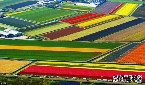 据外媒报道,近日,荷兰的郁金香大片绽放,从空中看上去像是一片片彩色的条纹,美得令人目眩神迷。