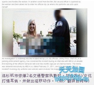 加州洛杉矶市惊爆2名交通警察执勤时与金发AV女优打情骂俏,并做出淫秽动作,这段影片并在知名成人色情网站流传;洛城交通局获报后展开调查,并强制2名员警带薪休假,但尚未做出惩处。