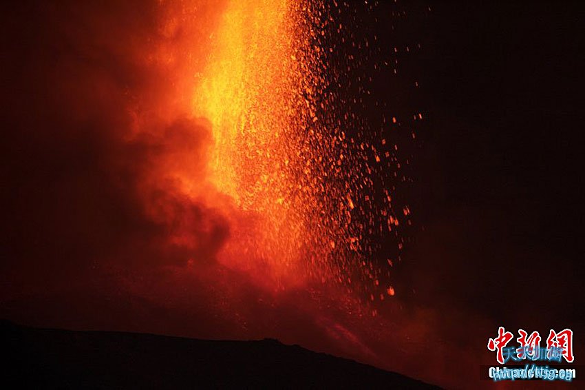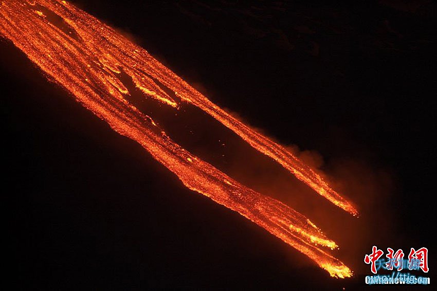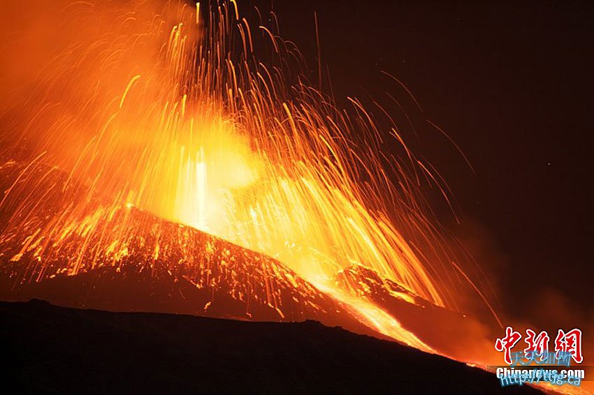 5 月12日,意大利西西里岛东岸的“埃特纳”火山喷发,摄影爱好者拍到火山喷出熔岩的景象,除了冒出烟羽状的火山灰之外,喷出的火热熔岩流从火山西南口喷出,向火山四周蔓延,场面壮观。这次喷发造成意大利阿韦利诺省卡塔尼亚-丰塔纳罗萨(Catania-Fontanarosa)的国际机场暂时关闭。