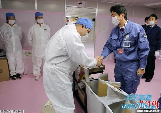 资料图:当地时间2012年12月29日,日本首相安倍晋三前往福岛县大熊町的福岛第一核电站视频并慰问工作人员。