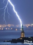 闪电击中纽约港自由女神像的照片 自由女神像被认为每年被闪电击中达600次 纽约摄影师杰伊菲恩上月底在曼哈顿炮台公园市夜间的暴风雨中拍下了壮观瞬间,一道闪电...