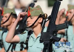 10月12日,一名西班牙女兵在马德里举行的国庆阅兵仪式中行进。当日,西班牙在首都举行阅兵仪式,庆祝国庆日的到来,西班牙陆海空和警察部队的3000多名官兵、150...